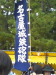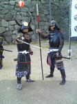 写真は鉄砲隊の旗と鎧試着コーナーのおじさまです。